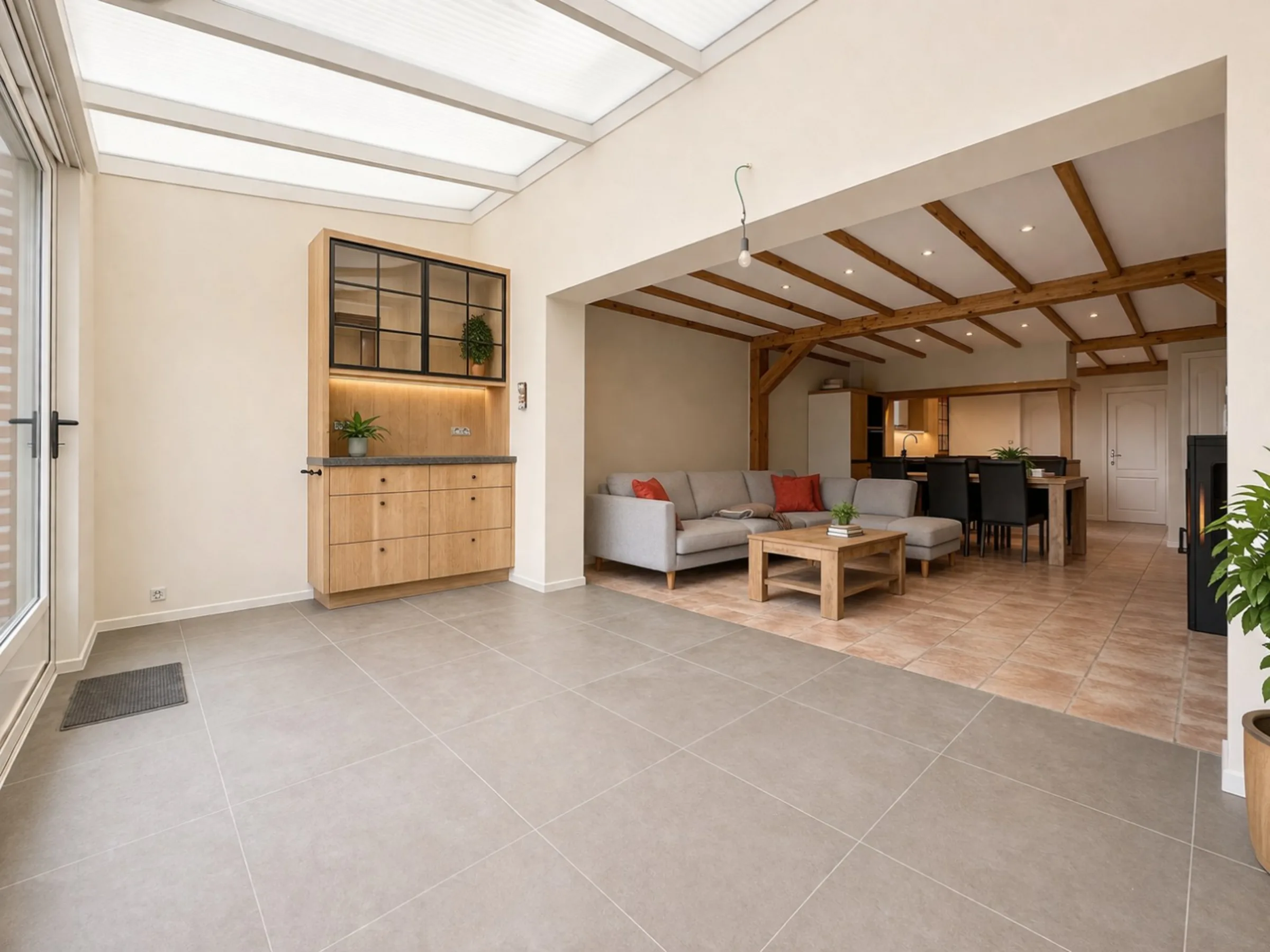 Via de oprit bereik je de garage en inkomhal met gastentoilet. De lichtrijke leefruimte met open keuken vormt het hart van de woning. De luxekeuken is uitgerust met een Lacanche fornuis (kookplaat, grill, oven, bordenwarmers) en biedt samen met de leefruimte een mooi zicht op de tuin. Airco zorgt voor comfort, zomer én winter. (zonnepanelen aanwezig)